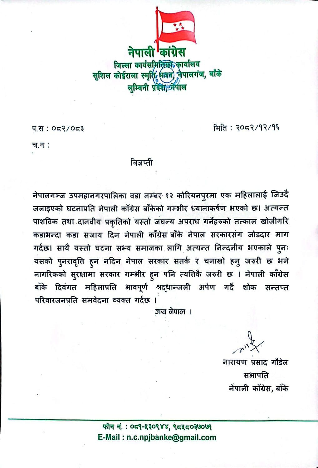 नेपालगन्ज उपमहानगरपालिका–१२ कोरियनपुरमा एक महिलालाई जिउँदै जलाएको घटनाप्रति नेपाली कांग्रेस बाँकेले गम्भीर ध्यानाकर्षण जनाएको छ । पार्टीको जिल्ला कार्यसमिति कार्यालयले विज्ञप्ति जारी गर्दै उक्त घटना अत्यन्तै निन्दनीय, अमानवीय तथा जघन्य अपराध भएको उल्लेख गरेको हो ।